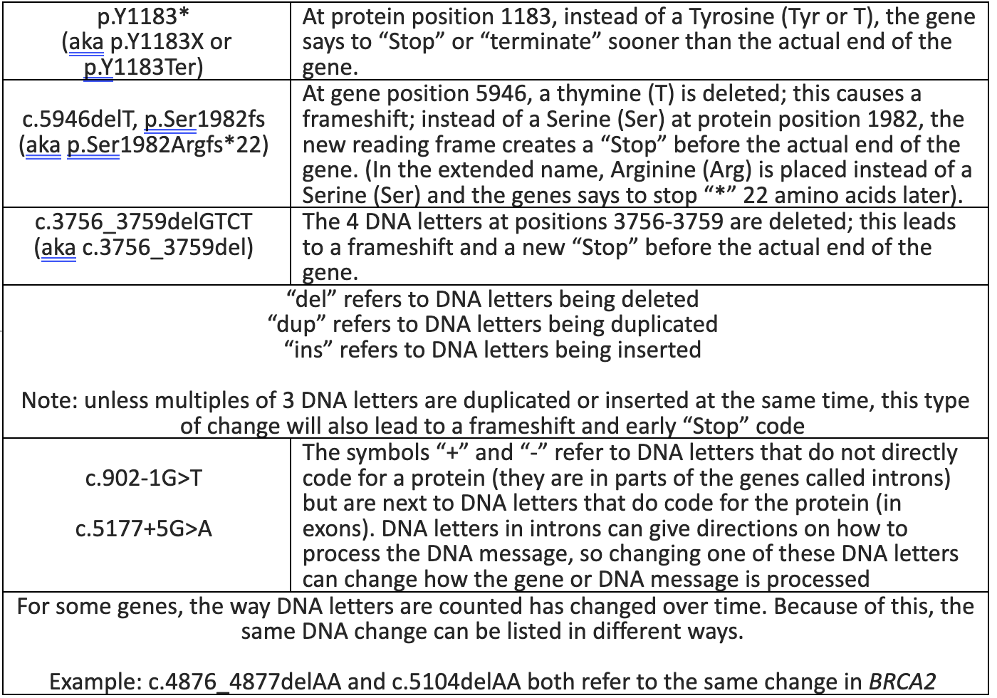 Some genetic variants are more complex than a substitution of one DNA letter or amino acid to another. Below are examples of different types of alterations and their meanings: